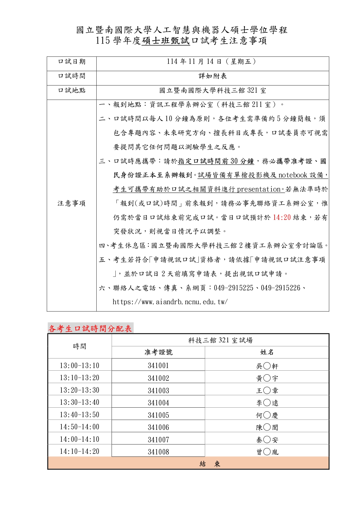 114人工智慧學程碩士班考試口試時間表及注意事項
